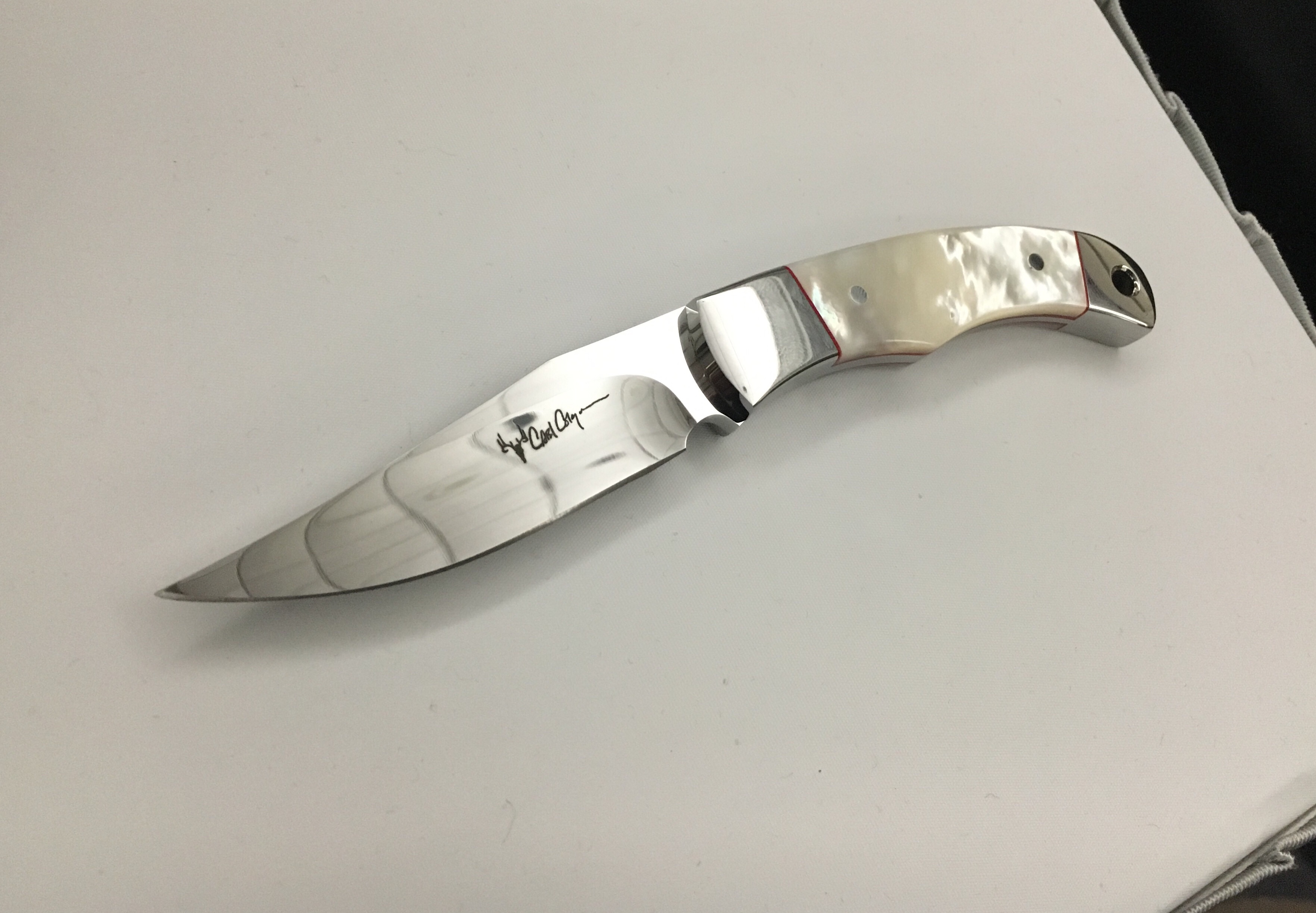 The man was holding a small fixed blade Colson had built. It had a mirror-polished clip point blade and similarly finished bolsters. Colson told the man he would like to make it as a folder someday.