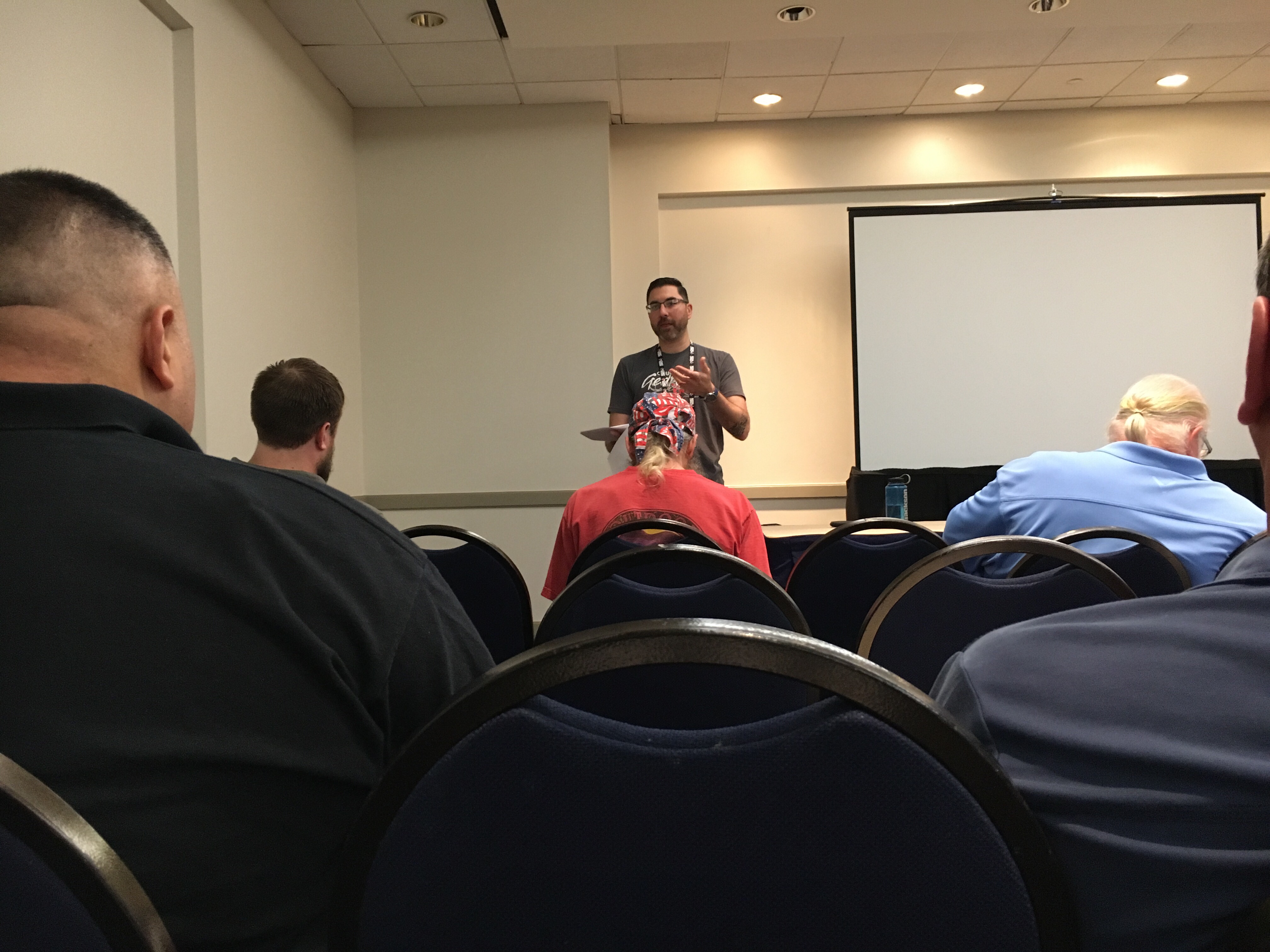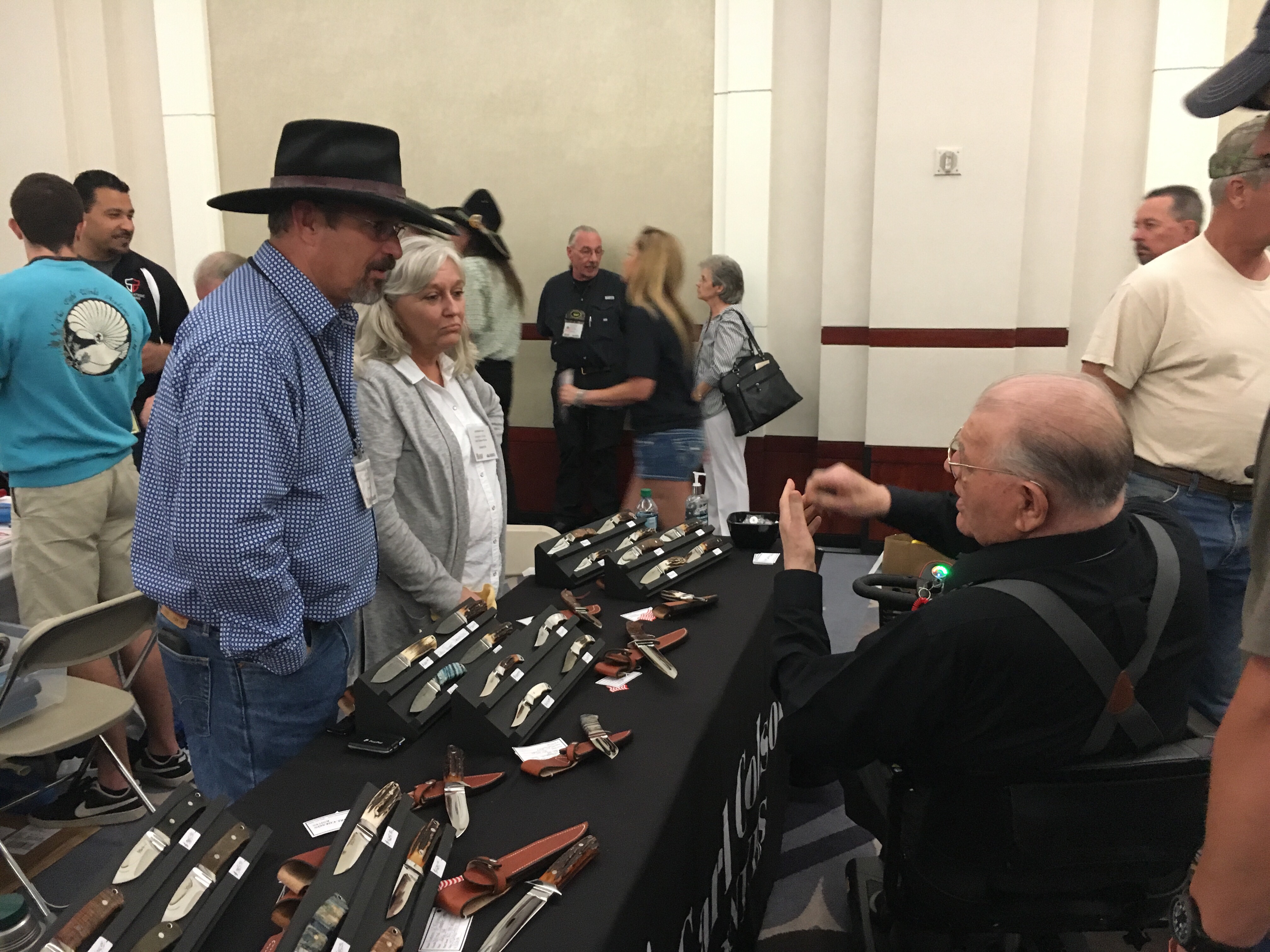 Hands down, my favorite moment of BLADE Show 2018 occurred as I wandered the custom makers’ tables. I overheard maker Carl Colson mention to show goers that he hailed from Florida. I circled back to his table and saw a man in a scooter talking to Colson.