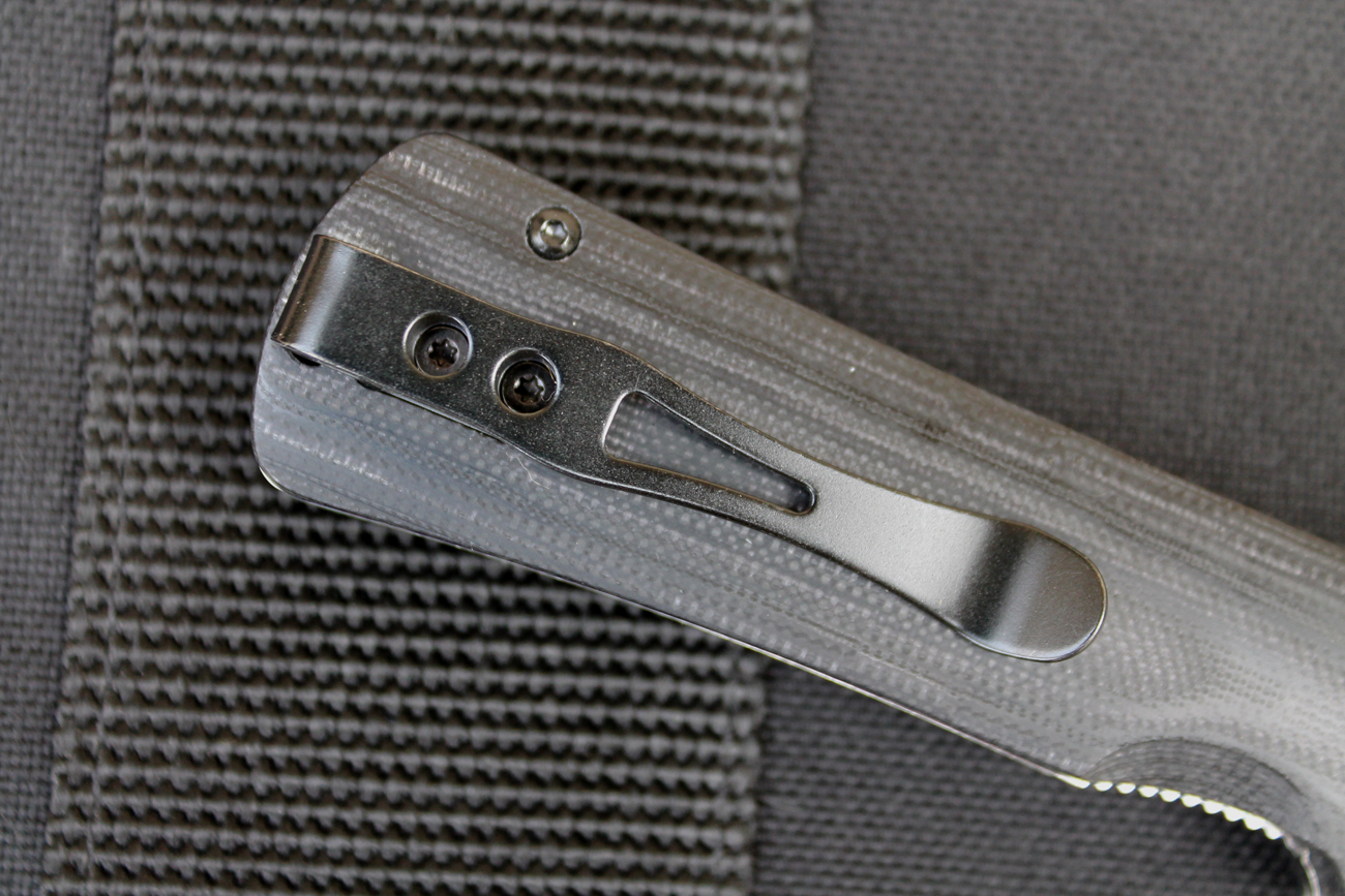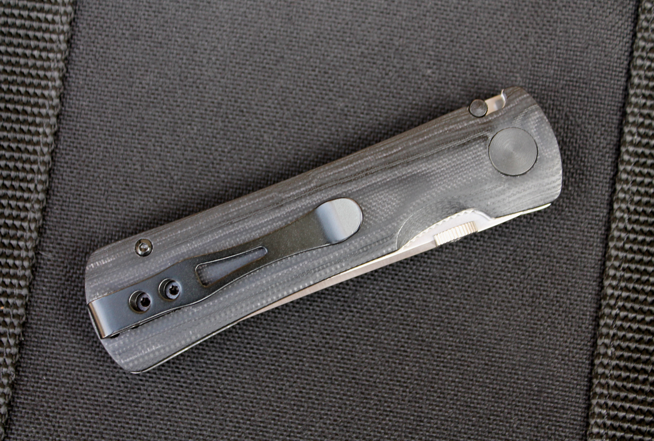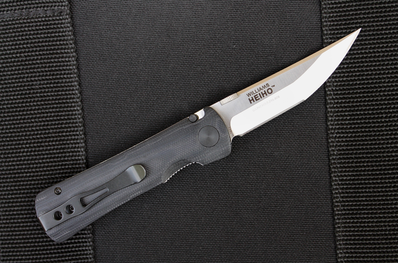 A black tip up reversible pocket clip is bent for deep carry.  At 4″ closed and 3.6 ounces, the Heiho will not drag down your kimono.  It has a slim, squared up profile that is an easy tote.