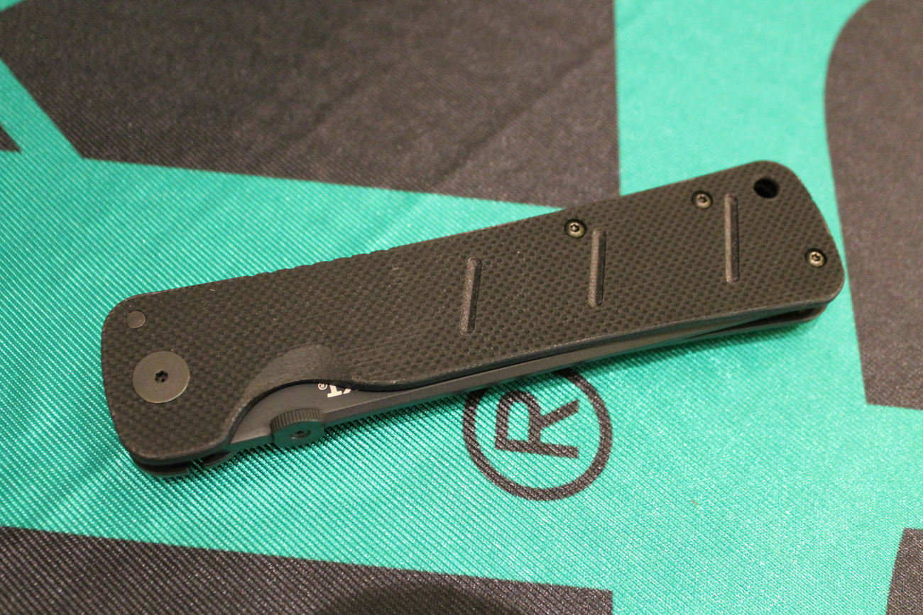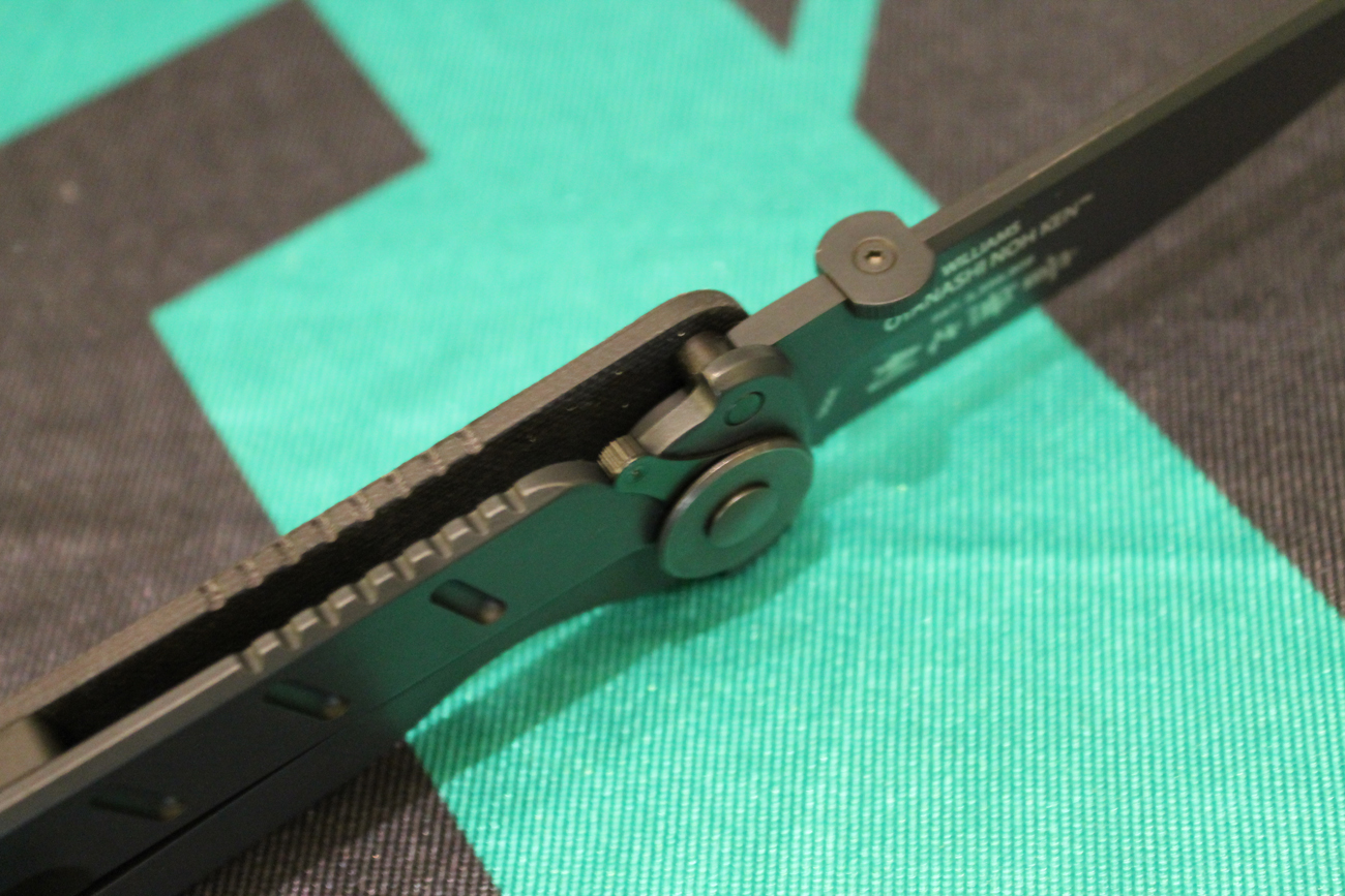 Okay, let’s talk basics. OnK is a frame lock folder with the left side scale done in textured G10. A thumb disk brings the knife open, the frame lock secures the blade, and the manual LAWKS™ feature provides a mechanical safety. The LAWKS switch has a long throw and feels comfortable under the thumb. Obviously, this proto functioned to specs.