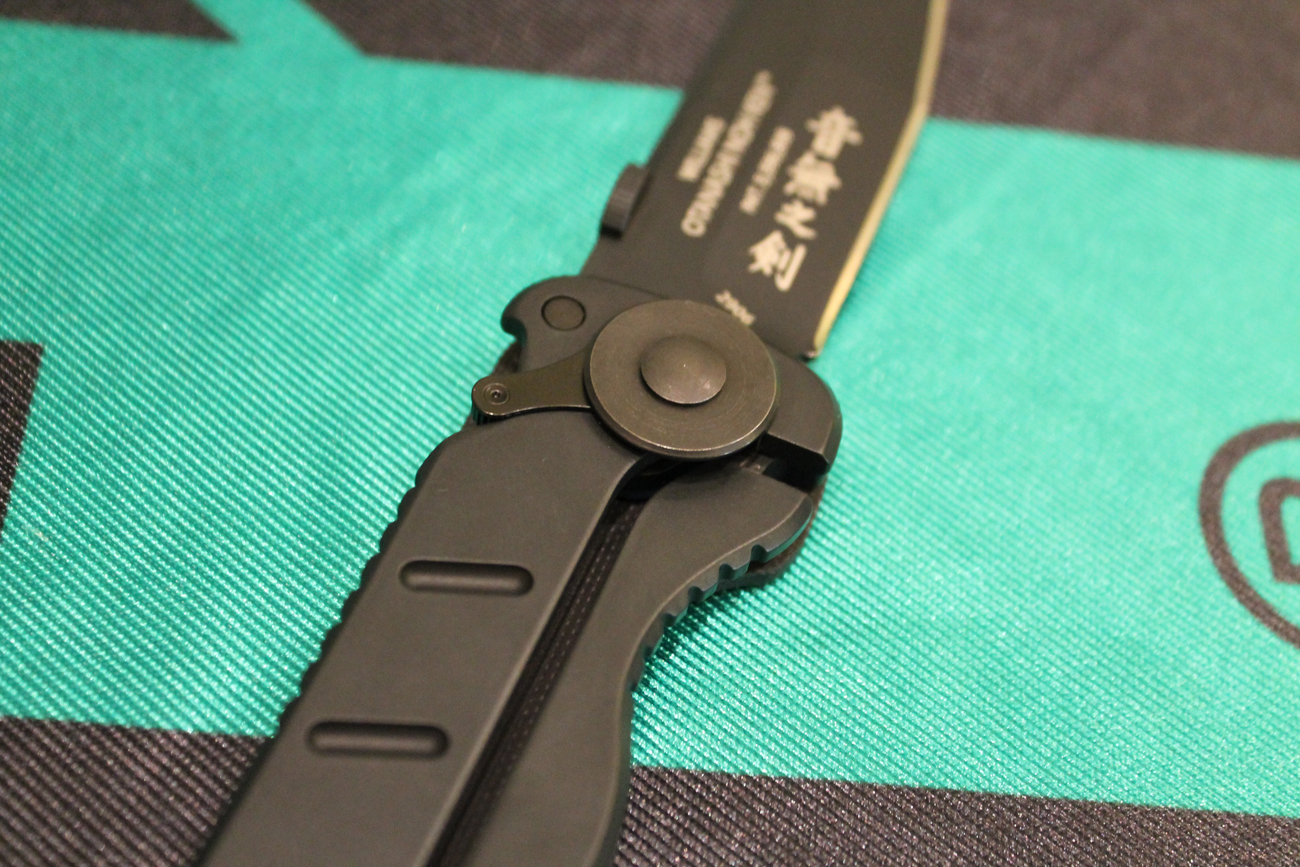 The angular tanto blade has a swedge along the top and is 0.16″ in thickness. AUS 8 steel, at HRC 58-59, gets an as yet unnamed black corrosion resistant coating. This knife is 10.13″ open, with a heft of 6.4 ounces. Again, nearly sword-like in proportions!