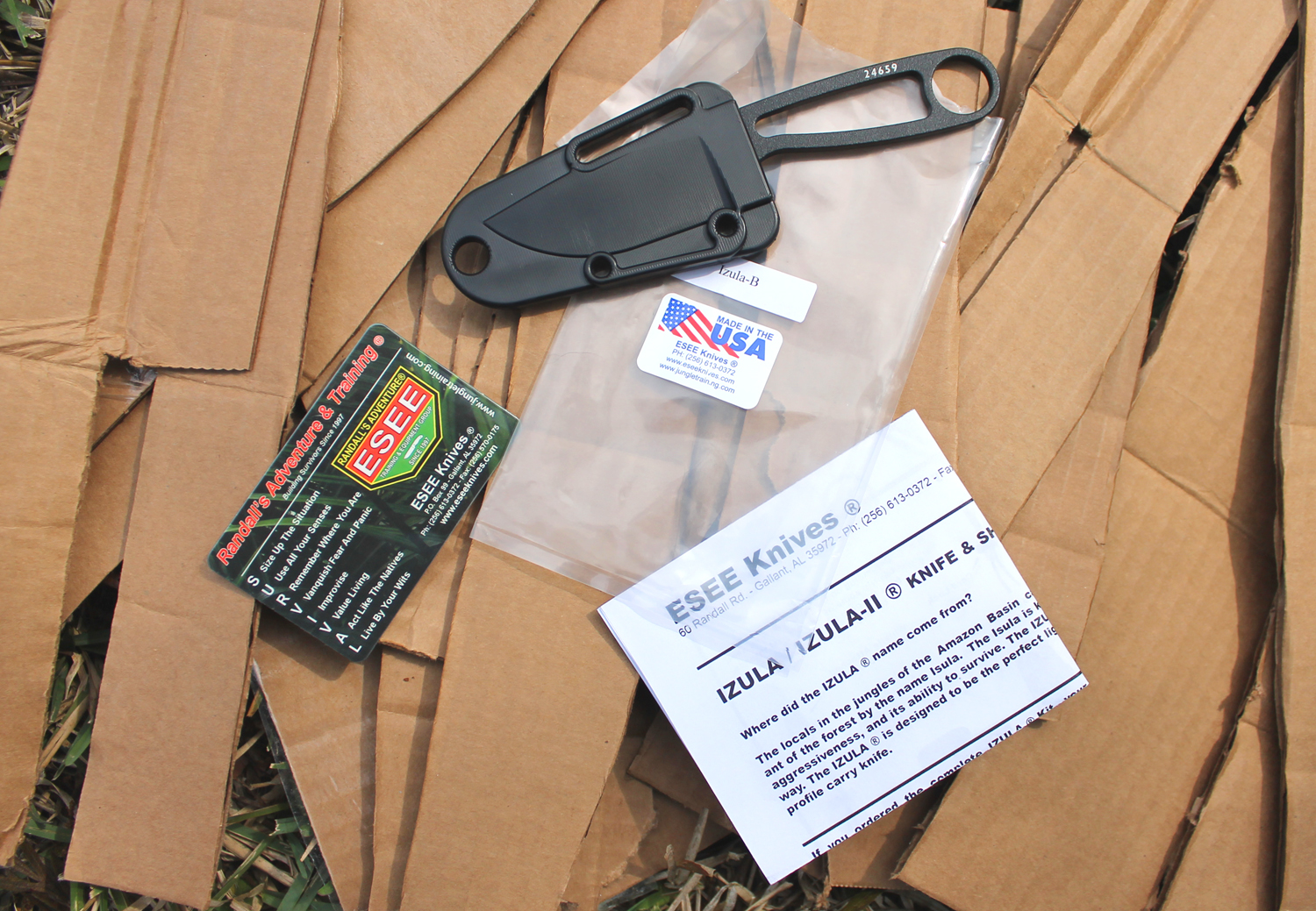 Skeletonized, the Izula’s handle can bear either ESEE’s canvas Micarta scales or a wrap of useful cord. Directions for cord wrapping even come in the instruction sheet with the knife. Did I mention that all the Izula components are Made in the USA? They are.