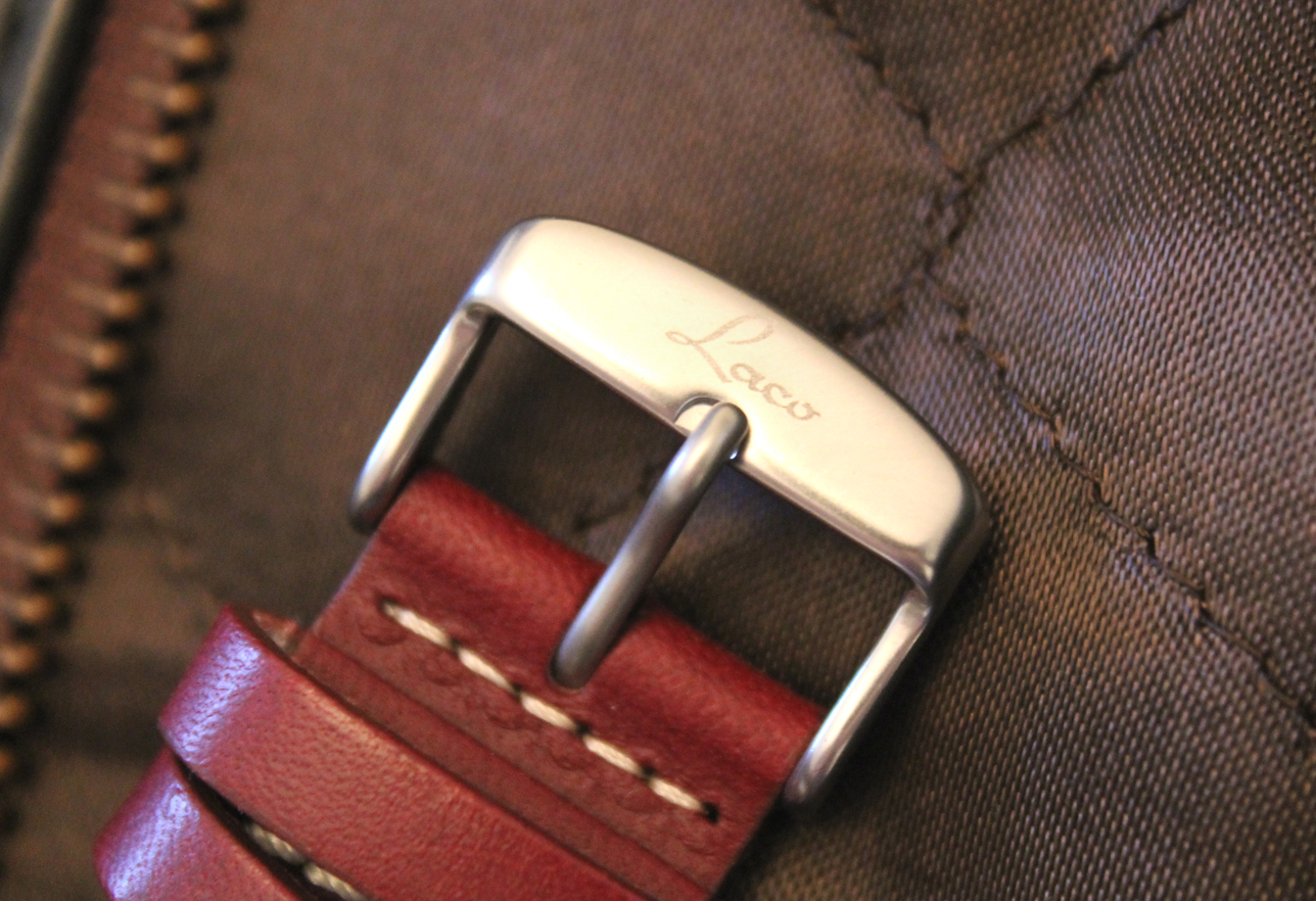 The brown leather pilot’s strap has the Laco name engraved on the buckle.  It is sized for larger wrists; I have to use the tightest setting in the strap since I have a small wrist.  The band is riveted and stitched with Germanic precision.