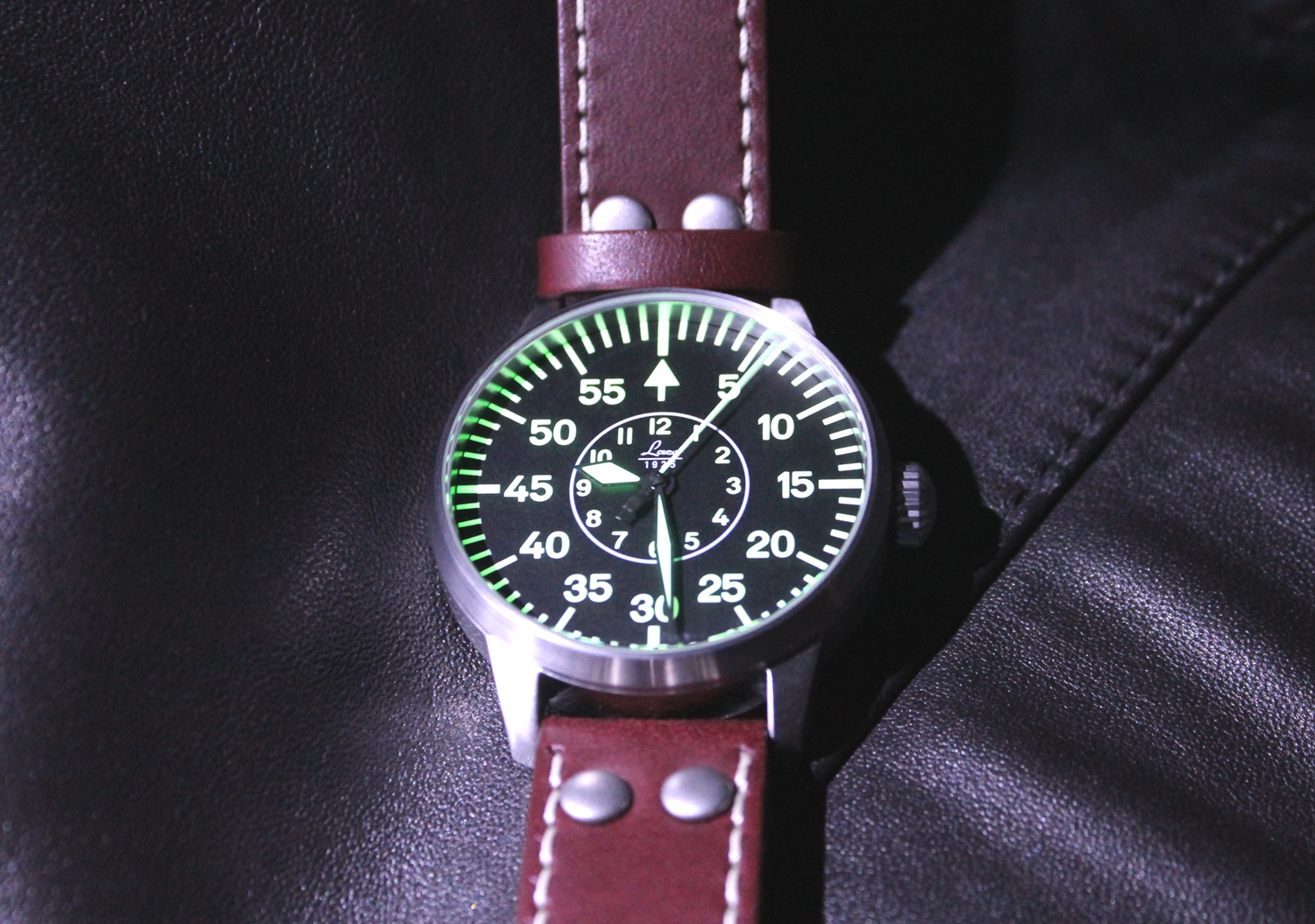 The black dial’s face is marked “Laco 1925.”  With a prominent arrow at 12 o’clock, there are Arabic numerals for seconds on the outer circle and smaller markings for the hour in the inner one.  The dial markings and hands are luminous.  In the dark, the very bright phosphorescent second markings reflect off the inside of the case giving a stunning effect!