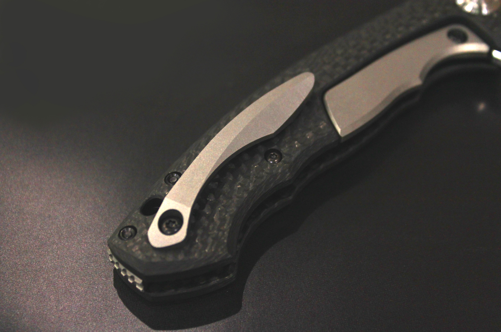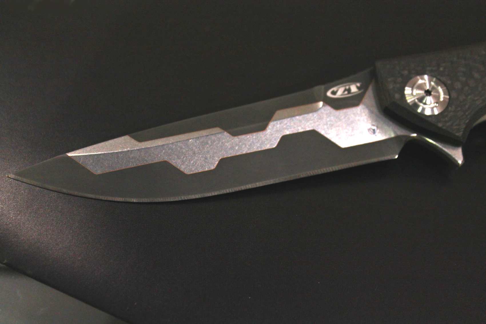 Machined carbon fiber handles contain a sub-frame lock with a titanium lockbar and a stainless steel lockbar insert for strength. I can attest that this knife flips open with smooth precision on its KVT bearings–ZT rep Jim McNair nearly had to wrest the knife from my hands to let others examine it.