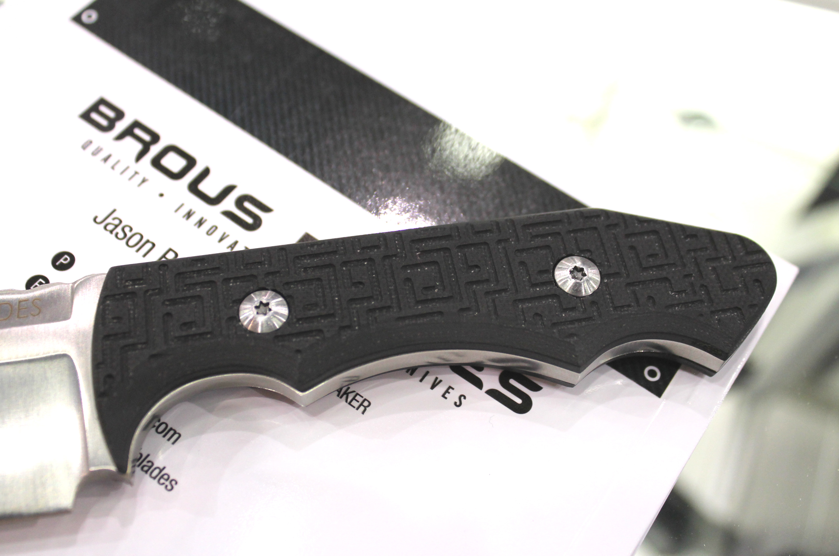 BrousTriple ThreatDespite my time being short at Blade Show 2013, I just had to swing by Jason Brous’ display to converse with him.  The backstory of this twenty-something year old maker is told in the unusual angles and curves in his work.  His knives are influenced by 10 years spent in his father’s CNC shop making precision medical equipment and by his love for biomechanical art.