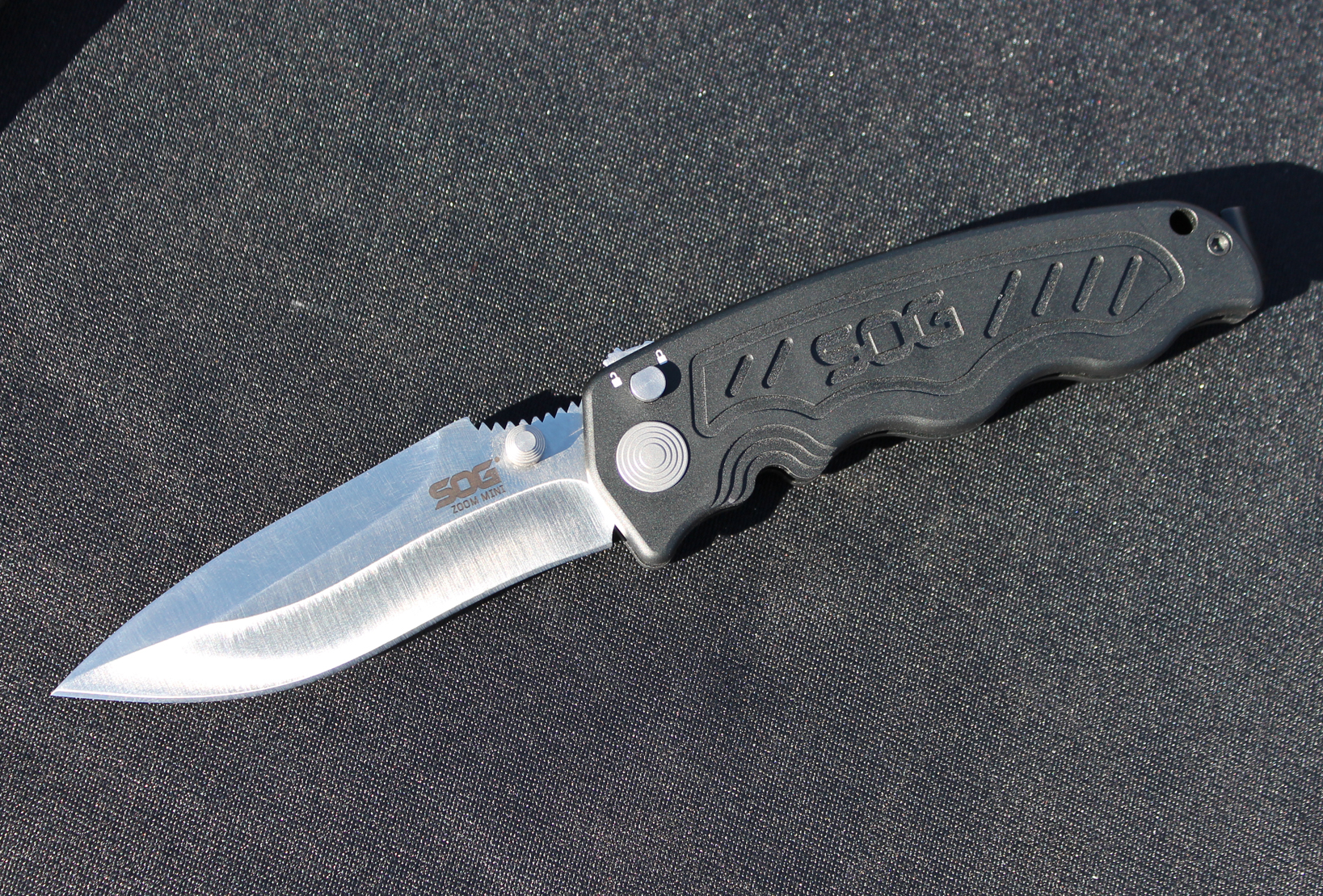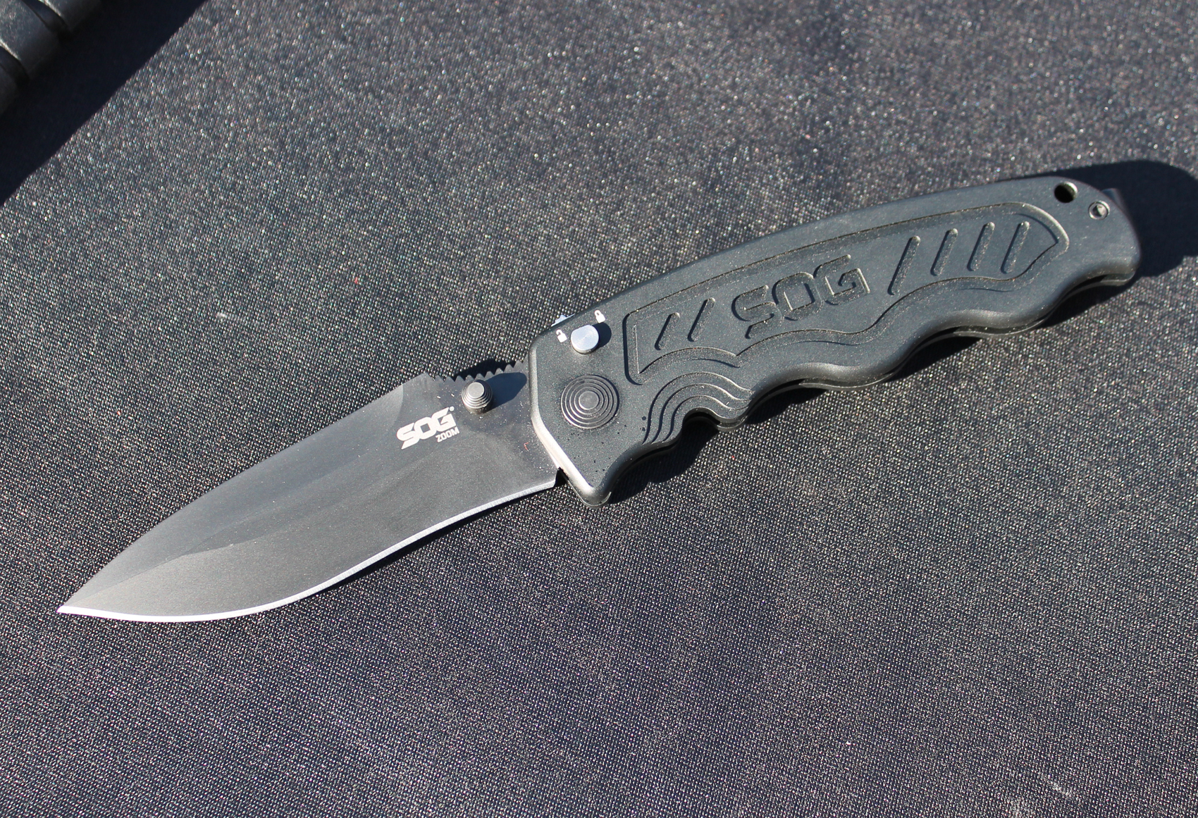 Out on the dusty range at Media Day, SOG Knives had new wares. Next to the SOG Kiku fixed blade were some new folding knives. SOG representative Chris Cashbaugh showed off a new folder in the Zoom series of knives. Using SOG’s assisted technology (S.A.T.), this knife was tuned to find the right balance between speed and force in opening the AUS-8 blade. I manipulated the knife and found that Cashbaugh was right, indeed. The Zoom had a nice snap without being too harsh.