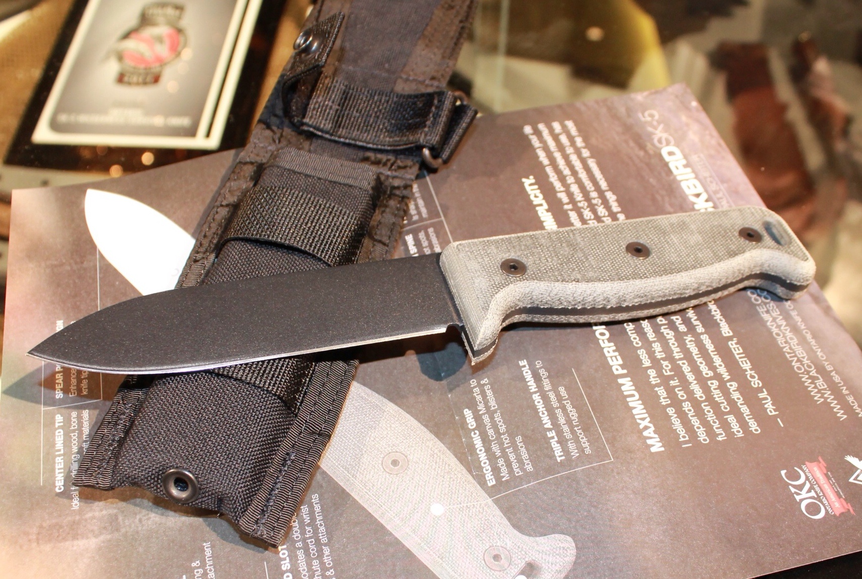 New for 2014 is the black-bladed Blackbird Noir. OKC said the knife steel is subdued with a Special Operations Capable (SOC) black powder coating. The original knife comes in satin finish. Crucible Material’s 154CM, at 0.13″ thick, is the basis for the full tang blade. It is hardened to 58-60 RHC. The Blackbird’s blade has a flat grind with a tapered cross-section. The butt is flat for pounding.
