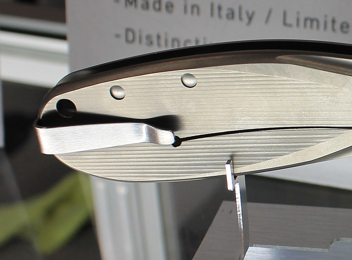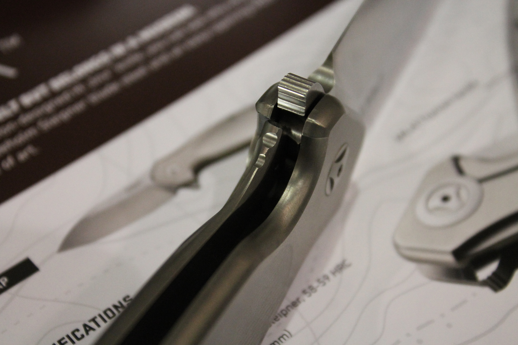 The blade length is 3.32″. It has a nice high flat grind. I love the industrial feel of titanium handles–they are almost warm to the touch. Hi Jinx is an extremely smooth flipper with its IKBS bearing system. The overall fit and finish befit a collectors’ knife with an MSRP of $500.00.