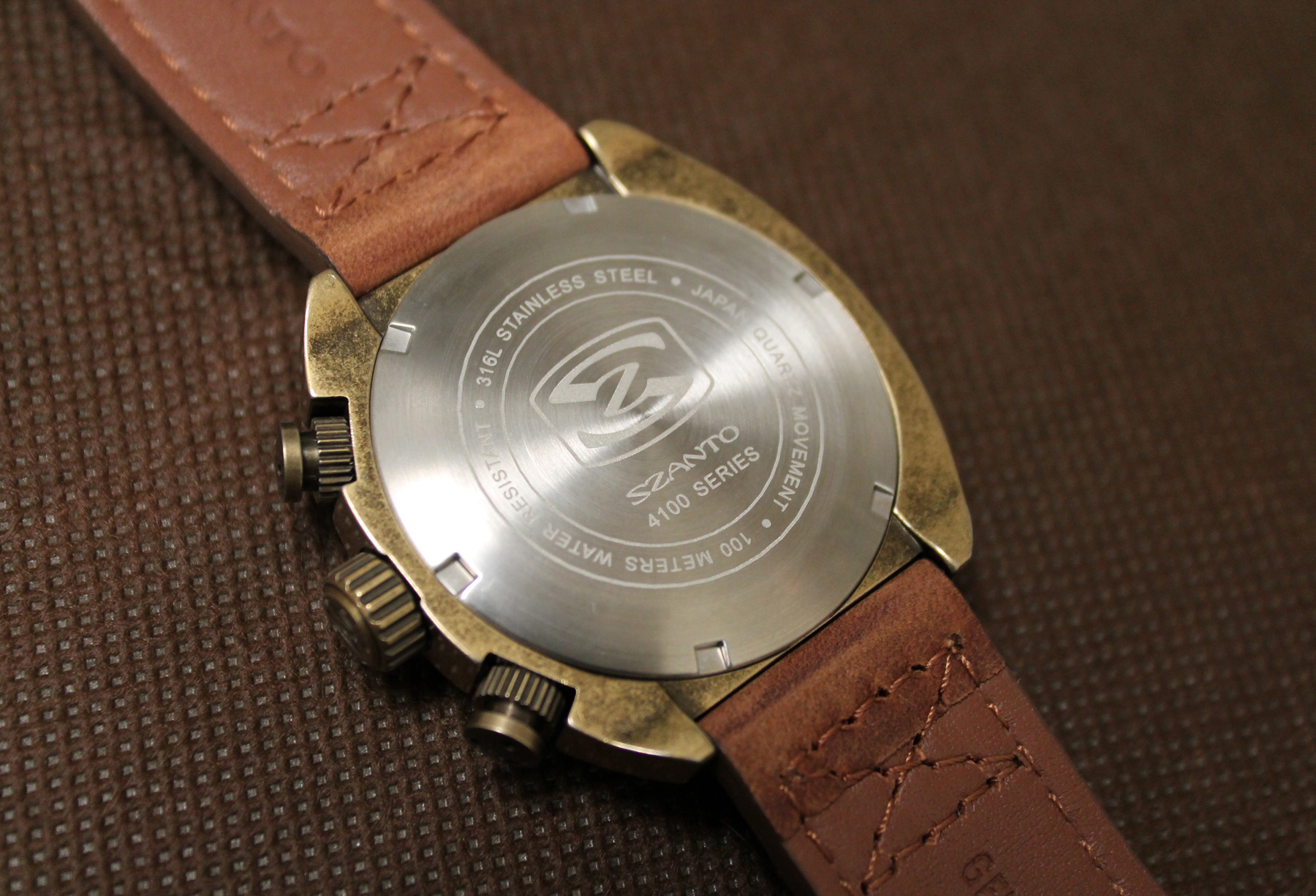 The 4102 is a large watch at 46mm overall case diameter with a 24mm wide calfskin band, but even for my smaller wrist, it wears well. The case is actually made of stainless steel, despite its bronzed appearance, and is water resistant to 100 meters. After a few months of use, the bronze finish is unscathed.