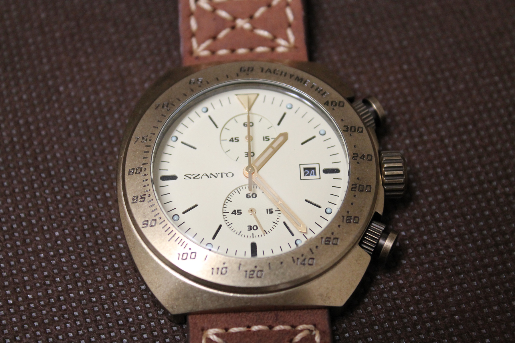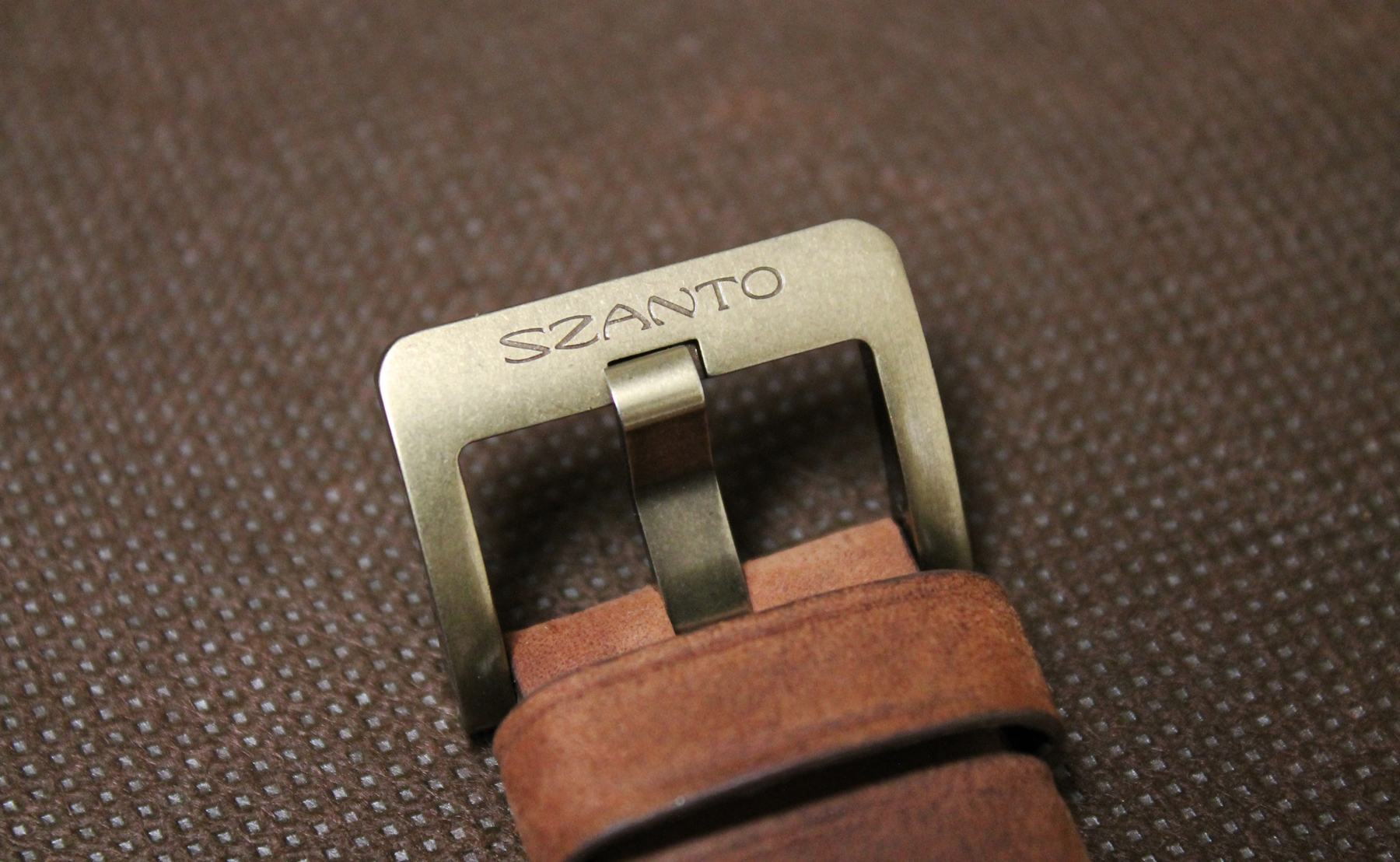 As I have previously related, Barry Cohen, Szanto’s owner/mastermind, has sought to bring turn-of-the-century design to the marketplace. When I saw the 4102, I was immediately reminded of an old style gauge from a creaky merchant marine ship or even a ’60’s sci-fi spacecraft. Antique distressed “brass” housing, ivory dial, and stitched brown leather band–perfectly Steampunk.