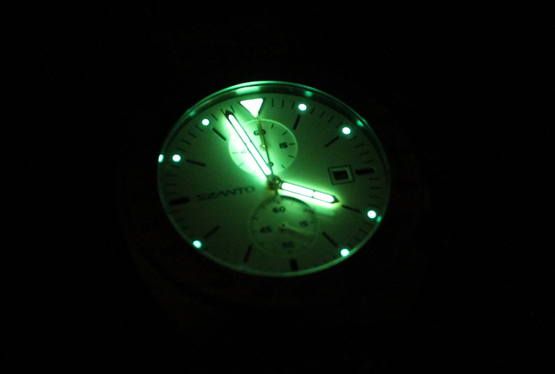 The 4102’s movement is a Miyota quartz two-eye date chronograph. I am a fan of the hash-marked tachymeter around the bezel, which adds to the handsome look, though I doubt I will be timing rockets with it. Another nice touch is the slightly domed, hardened mineral crystal. It gives the watch a little extra shape and a luxury feel.