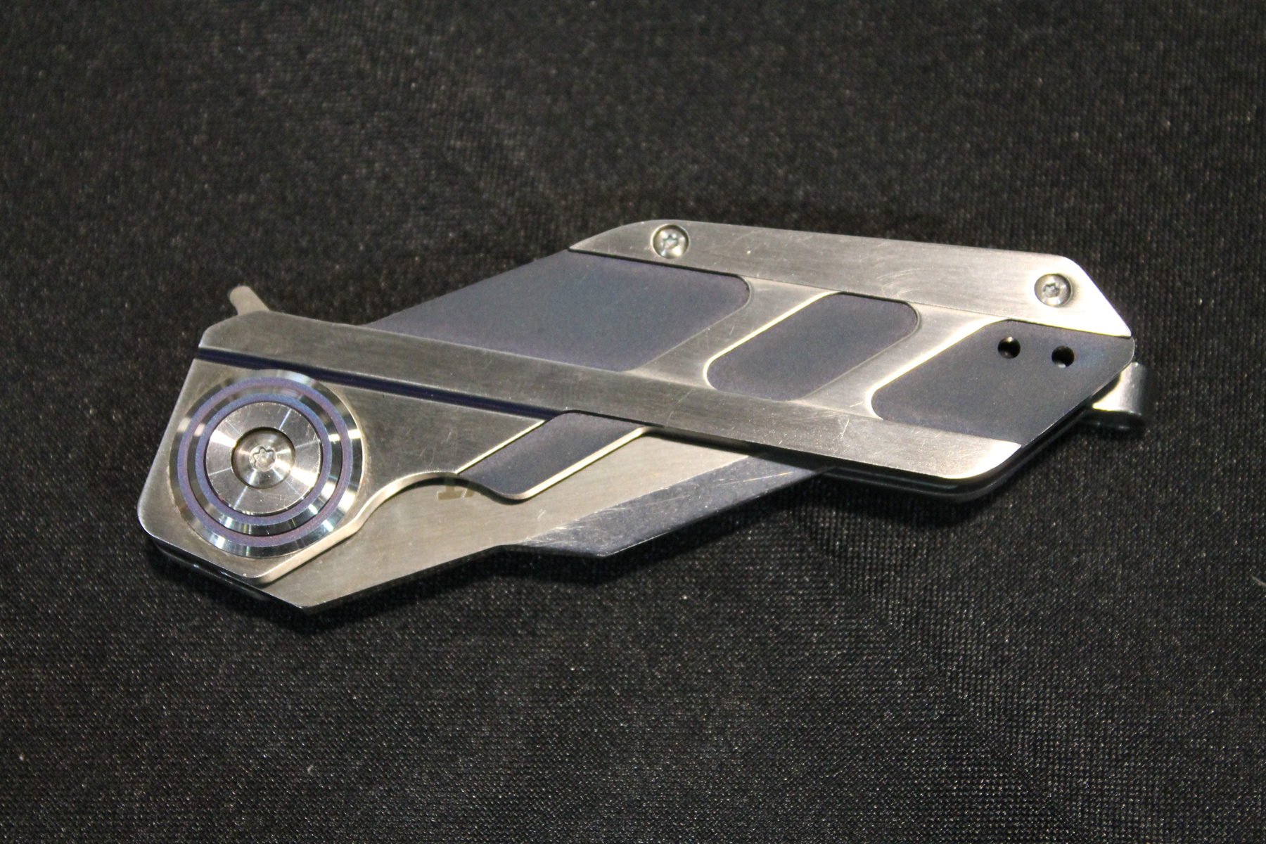 The unusual handles are made from 2Cr13 stainless steel with a titanium nitride finish. Blues in the handle contrast with the blue-purple in the pivot. Combined with the mirror and satin finishes to the blade itself, the whole package pops.