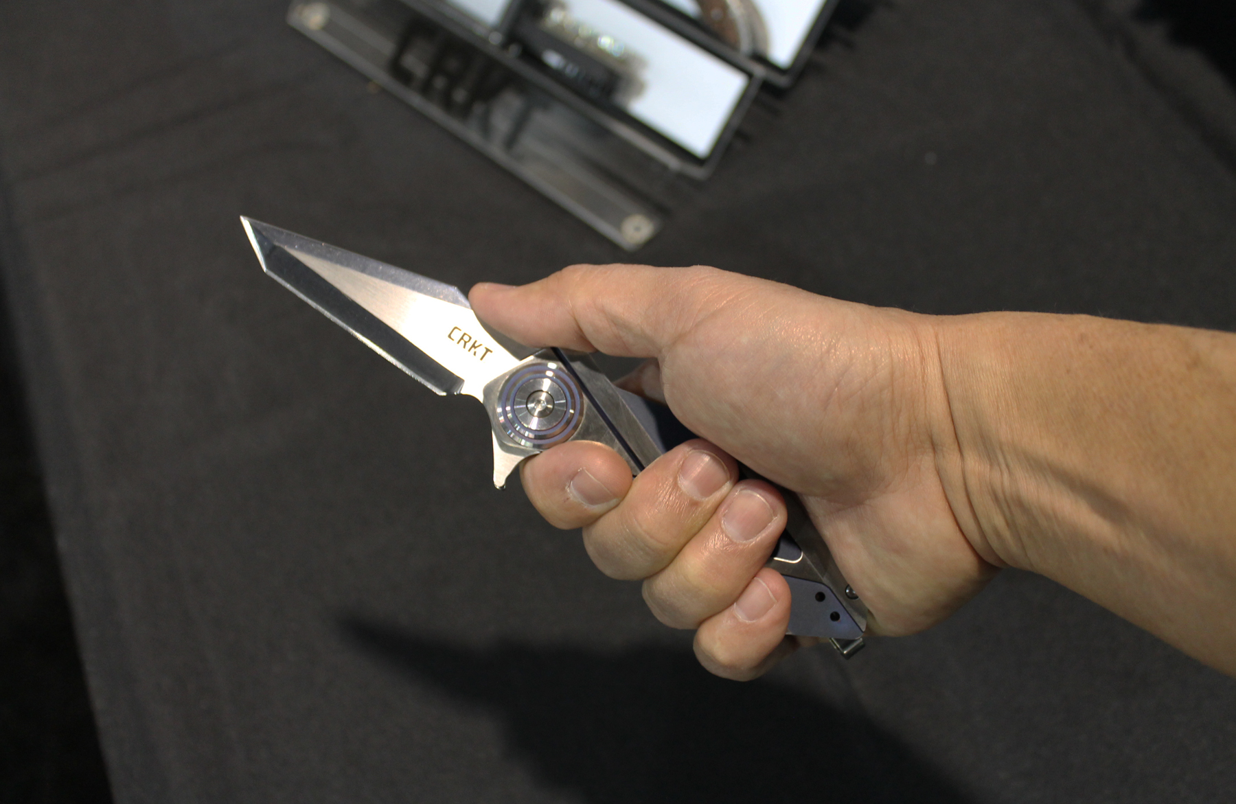 Columbia River Knife & Tool had a new art knife at SHOT Show 2015 which showcased a sci-fi-ish design by Terry Lee Renner. My photos of the knife do not do this one justice. The lighting in the Sands Convention Center is sadly inadequate for good photography, especially of shiny things.