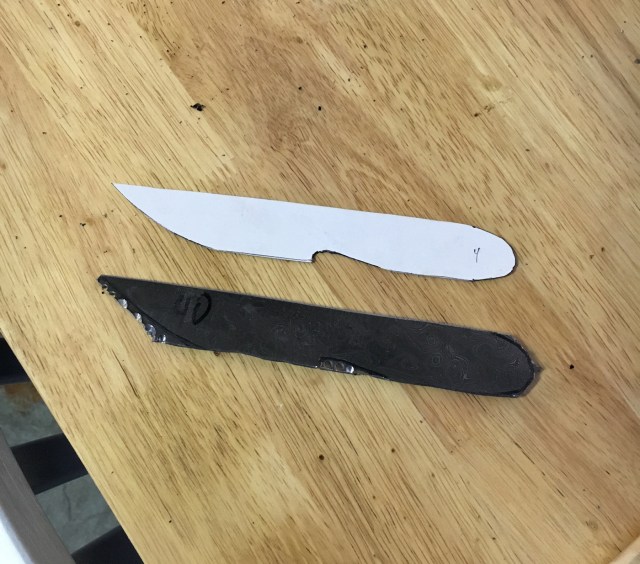 For patterning, I began by tracing the outlines of the steel blanks I had purchased on plain paper. I wanted to make blade shapes that conformed to the narrow Alabama Damascus I would use. After exploring various patterns, to include wharncliffes, drop points, and bowies, I settled upon the basic kwaiken shape. I reasoned that the straight topline would help by minimizing the amount of steel I would have to grind away. And I like kwaikens!