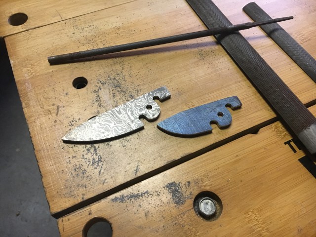 Whew, this was quite the project. I had a scrap of Alabama Damascus that was too short for a fixed blade knife. My thought was to turn it into a simple folding knife. I would name it “Lil’ Scrappy.” Sounded easy. It was not.