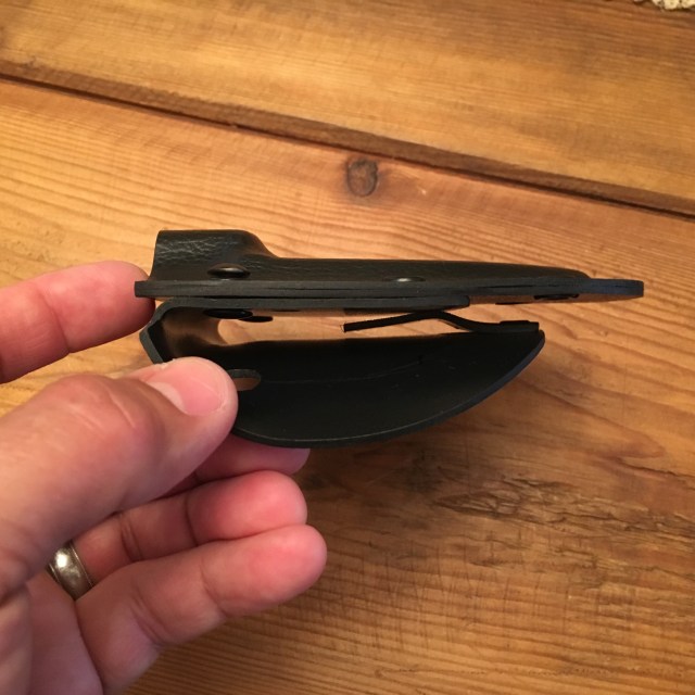 After heating the plastic, I laid it over the cylinder and folded back the mounting portion. Hmmm, that seemed to do it. I riveted a small bent rectangle of Kydex to the back of the paddle to snag clothing when pulled up to keep the rig from sliding out easily.