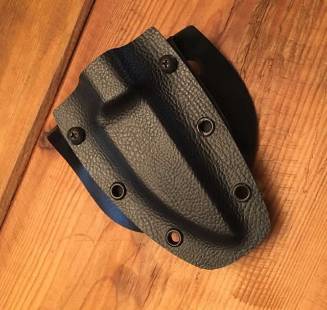 Rummaging in my cave of junk, I found an old paddle mount for a BLACKHAWK! Kalista fixed blade knife I had bought decades ago. If I fashioned a new flat-backed sheath out of Kydex, I could drill the holes to match the paddle and I would be in business.