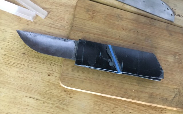 The blade material is Alabama Damascus and the handle scales are blue and black G-10 with a black G-10 backspacer. I used a hardened stop pin and pivot and bronze bushings.
